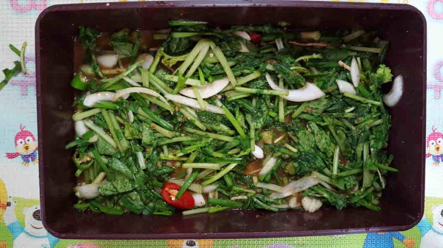 6. 물을 1400미리 넣은 상태에서 열무를 넣었더니 물이 너무 적은 것 같아서